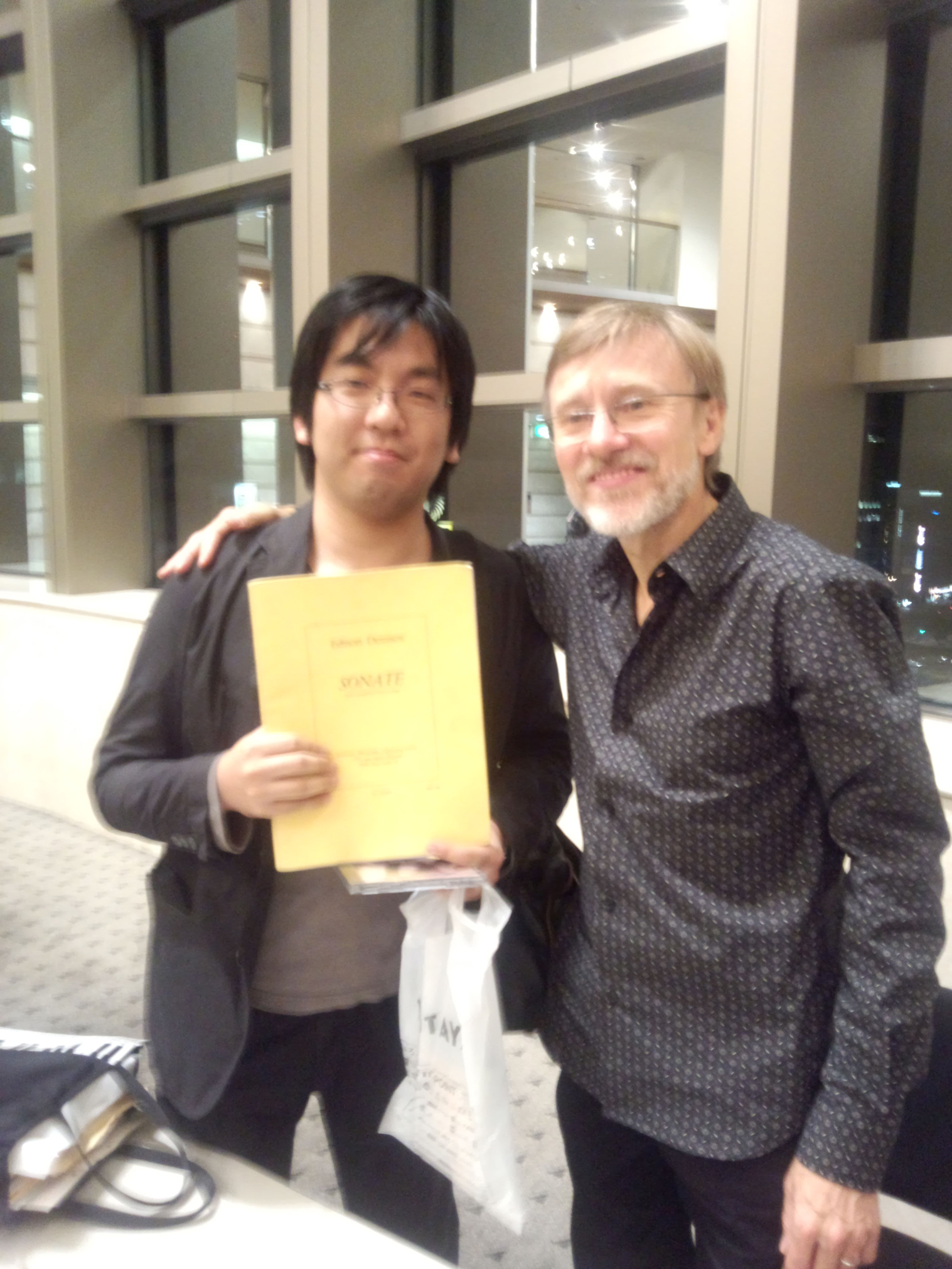 公開レッスンで教わったデニゾフ作曲「ソナタ」の楽譜を掲げて、ドゥラングル先生とツーショット♪