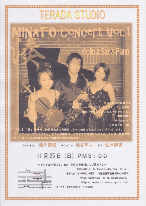 ヴァイオリン・サックス・ピアノによるトリオ「湊」のコンサートがあります。